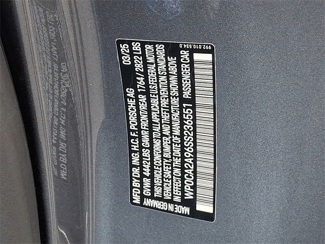 Certified. Vanadium Gray Metallic 2025 Porsche 911 Carrera RWD 8-Speed Porsche Doppelkupplung (PDK) 3.0L H6 Turbocharged DOHC 24V LEV3-ULEV70 388hp CALL US DIRECTLY AT 610-279-4100, PORSCHE CERTIFIED, CLEAN CARFAX NO ACCIDENTS, TWO KEYS, NAVIGATION, LEATHER SEATS, BACK UP CAMERA, BLUETOOTH STREAMING, 911 Carrera, 2D Cabriolet, 3.0L H6 Turbocharged DOHC 24V LEV3-ULEV70 388hp, 8-Speed Porsche Doppelkupplung (PDK), RWD, Vanadium Gray Metallic, Dark Night Blue w/Lthr Seat Trim w/Lthr Interior & Chalk Stitching, 14-Way Power Sport Seats w/Memory Package, ABS brakes, Adaptive Cruise Control, Alloy wheels, BOSE Surround Sound System, Electronic Stability Control, Emergency communication system, Exclusive Design Taillights, Extended Range 22.1 Gallon Fuel Tank, Front dual zone A/C, Front Ventilated Seats, HD-Matrix Design LED Headlights, Heated door mirrors, Heated front seats, Illuminated entry, Ionizer, Lane Change Assist (LCA), Leather Seat Trim, Low tire pressure warning, Navigation System, Porsche Communication Management, Porsche Crest on Front Headrests, Power Steering Plus, Premium Package, Remote keyless entry, Smoking Package, Sound Package Plus, Sport Chrono Package, Sport Exhaust System w/Tailpipes in Black, Storage Net in Passenger Footwell, Surround View w/Active Parking Support, Traction control.