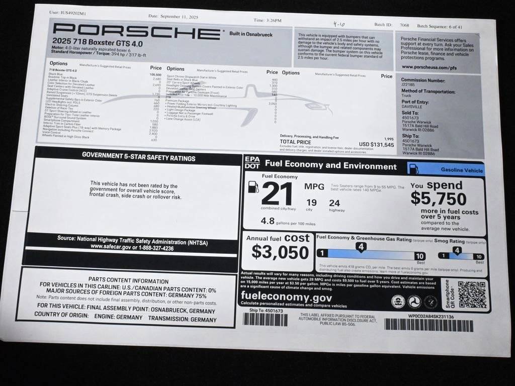 Shark Blue 2025 Porsche 718 Boxster GTS RWD 4.0L H6 DOHC 24V LEV3-LEV160 394hp